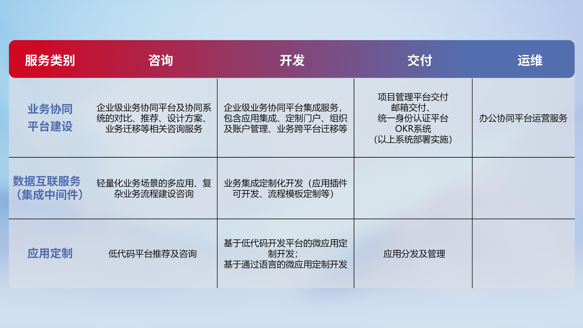 针对钉钉、、企微、、IDaas等平台级产品提供产品的规划、、、、方案、、交付、、定制化开发等服务,,实现如统一协同办公、、、、智能客户服务、、混合会议管理、、、、智能数据查询、、、、等业务场景,,,,实现数字化转型。。